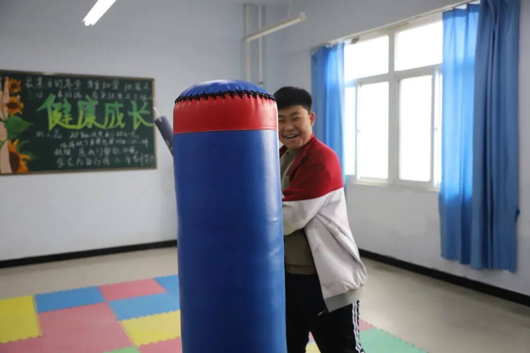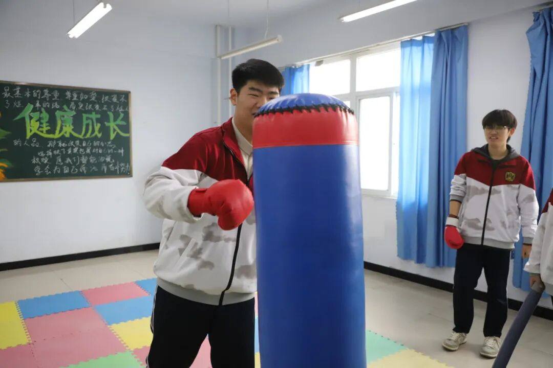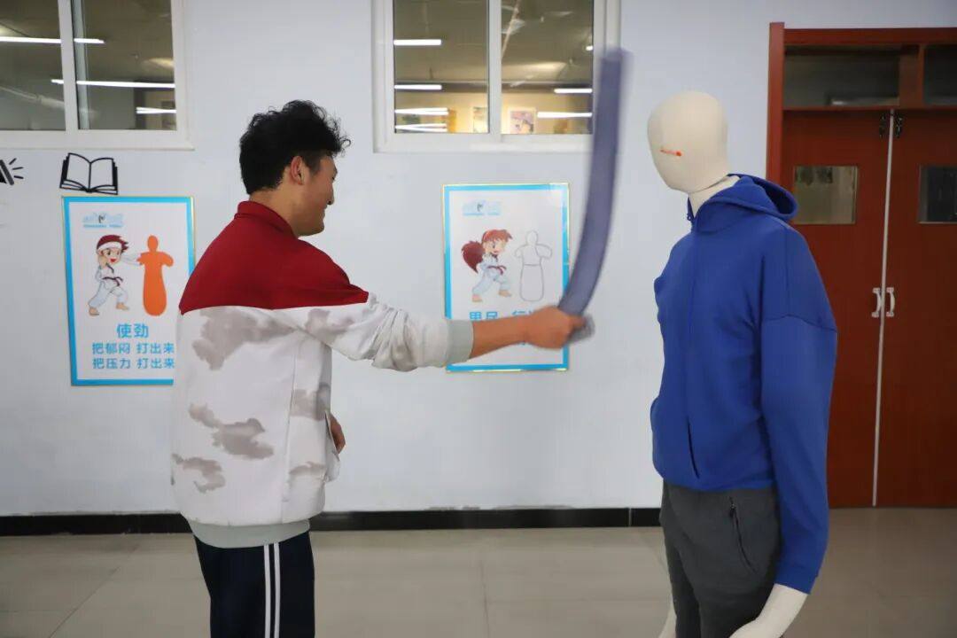 在安全的宣泄区域,专业的拳击包和特制的假人模型,为同学们提供了一个释放压力的物理空间。戴上防护手套,选择适合自己的方式,或是有节奏地挥拳,体验力量与控制的结合;或是通过击打,将积蓄的情绪转化为一次畅快的身体表达。每一次用力的挥出与收回,是学习与内在压力健康共处的方式,让情绪通过安全的通道得以流动和转化。