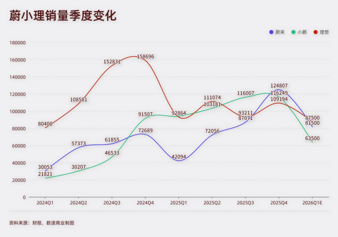 此消彼长之下,2026年,三家车企又回到了拉锯状态,理想预计全年销量为50万台,小鹏为55万-60万台,蔚来则为45.64万至48.9万台之间,差距很小。