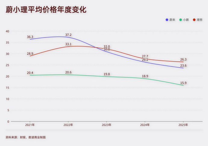 车企没有公布ASP,但结合汽车销售收入与销量,粗略估算,从2021年到2025年,蔚来的ASP从36.28 万元降至23.58 万元,累计下降35%。