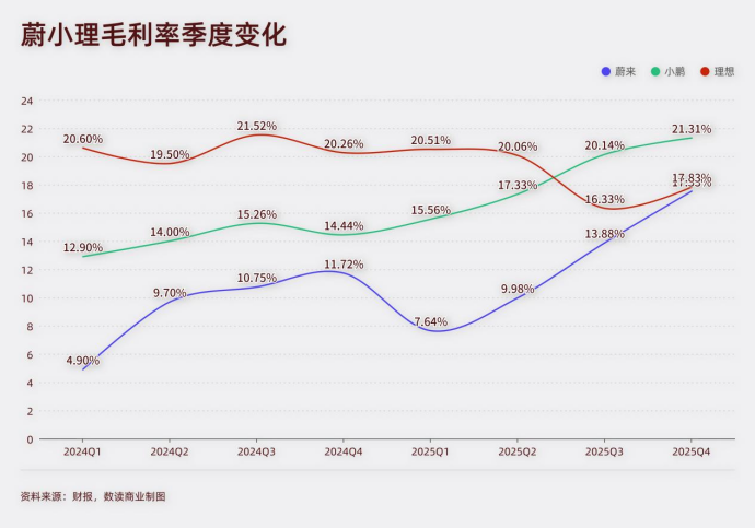 2025年,理想的毛利率连续两个季度跌破20%红线,这是创始人李想曾经十分看重的红线。与之相比,小鹏连续两个季度突破20%,蔚来也一路飙涨,四季度几乎与理想持平。