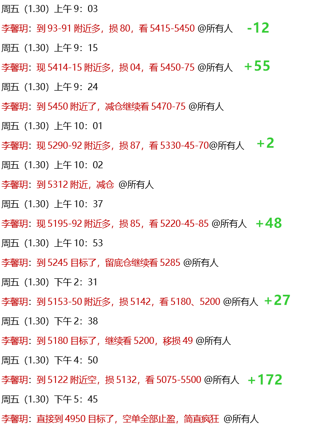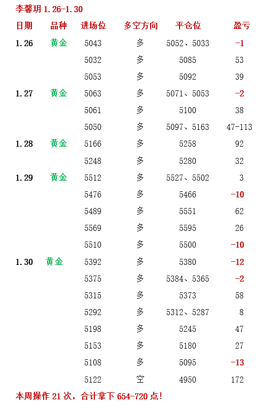 1.31 回顾本月,黄金大涨1300点的同时,月尾大跌900点的幅度同样创造历史,所以在狂欢的同时,也要敬畏市场。至本月初开始,馨玥就给出了4900中期目标,期间一路看涨做多,在突破4550后直接给出5400-5500长期目标,连续做了一个月的多单,盆满钵满。而从本周四早间开始,文章就开始强调临近变盘窗口期【分析可翻之前博文】,谨防回落风险,周五跌破5105后,反弹给出了5122空单,一单拿下接近200点利润!整体来看,1月圆满落幕,没有遗憾,希望大家也能先知先觉,多思考,形成自己的判断!