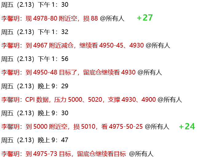 实盘中,午后安排的4978空单,顺利到4950-48目标!晚间按策略,又安排了5000附近空单,也顺利到4975-73目标获利!整体落袋50点,周五圆满收官!本周一到周三,低多全部精准大赚,周四波幅清淡没有安排,周五高空又是连续兑现收割!公开策略全网见证,拒绝马后炮!恭喜关注的朋友,过肥年!
