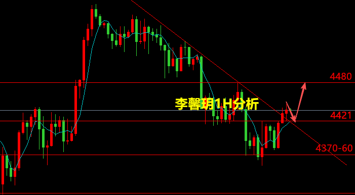 日线隔夜收中阴,是反弹修正后再确认压力进一步调整的过程,整体还是弱势表现,但4H周期布林收口,均线粘合,午夜止跌4350后回升,短线转为震荡形态,目前突破4421凌晨反弹高点,日内就先看延续反弹力度,强弱分水岭在4450附近,有效站稳再看4480甚至4500上方,支撑在4421、4370-60。