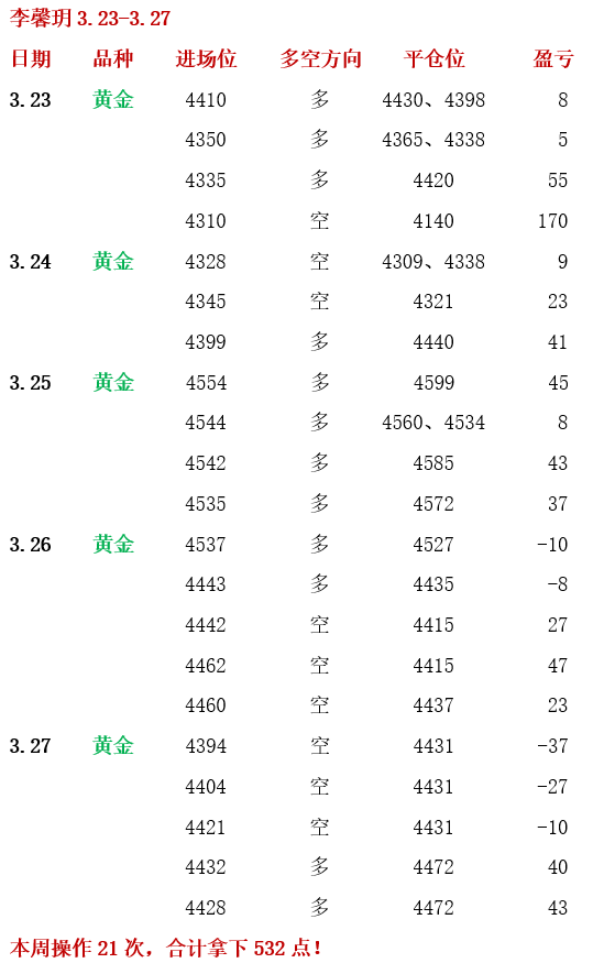 3.30 周一,黄金周评中强调过,保持震荡思路对待,虽然策略4410做多差一点上车,但我们不去马后炮!实盘中,上午先安排了4468-70空单,尝试博弈分水岭压力,但无奈上破扫损出局!而后回踩4478直接安排多单跟进,短线突破果断跟进,目前已到4450大幅获利,减仓持有中!