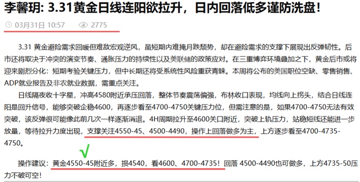 李馨玥: 3.31黄金4550公开多获利,晚间依旧回落多!