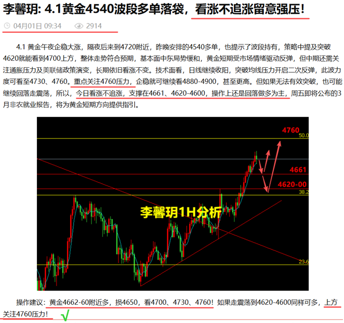李馨玥: 4.2黄金早间4665已多,回撤修正待二次突破!