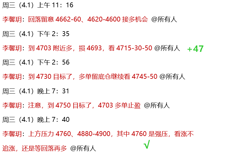 4.1 周三,早间策略黄金4662做多,实际日内回踩4667后拉升,符合回踩做多思路,同时4760压力也精准预判回落!实盘中,虽然没到策略做多位置,错过了低点进场机会,但午后也安排了4703多单,顺利达到4750目标,先斩47点利润!晚间上冲给了个别激进学员4760空单,再获利! 日内先多后空,实操知行合一,策略思路完美兑现!