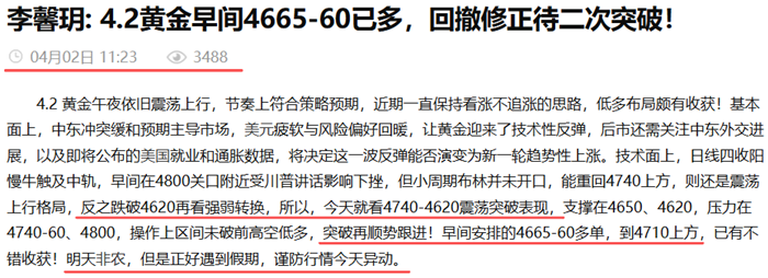 李馨玥: 4.2黄金高台跳水一语成谶,晚间承压继续空!