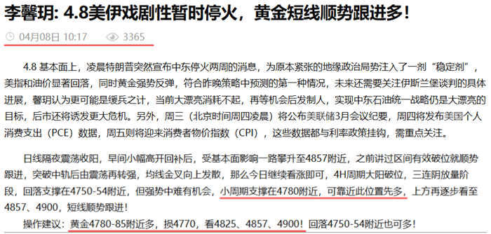 李馨玥:4.8黄金4780策略多单已上车,白盘两连多已落袋!