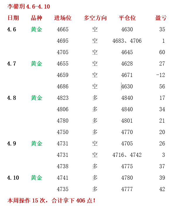 4.10 周五,黄金早间策略4736-35低多,完全符合预期上涨!实盘中,白盘下探先安排了4741多单,欧盘二次下探后,到4735继续做多,持有至美盘CPI公布后,到达4777-80止盈出局,整体斩获81点!恭喜关注的朋友,本周策略完美把握,全网见证,往前翻随便查验,跟上的都有不菲收获了!本周15单只错1单,祝大家周末愉快!