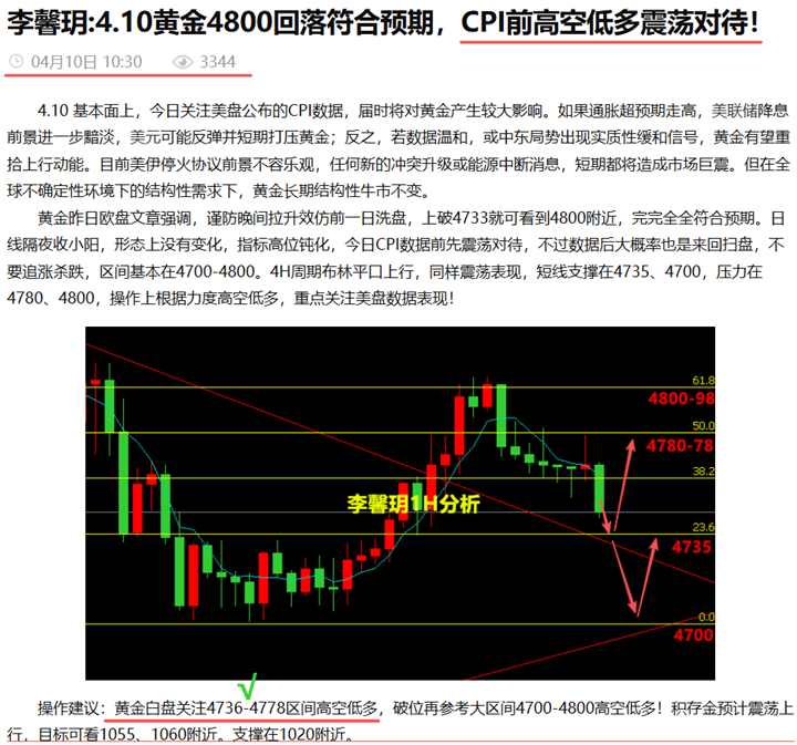 李馨玥:4.11黄金盘尾区间再应验,CPI核心走软下周预测!