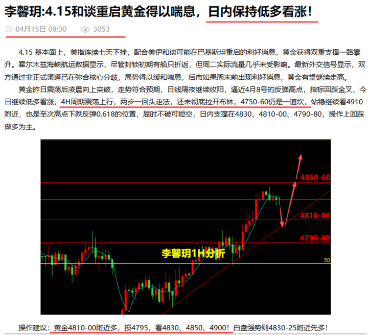 李馨玥:4.15黄金探髙回落借机调整,晚间还是回落多!