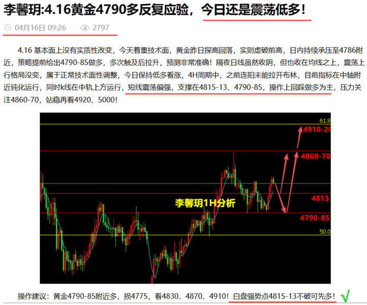 李馨玥:4.16黄金4813策略多先下一城,晚间回踩依旧多!
