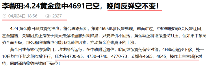李馨玥:4.24黄金4740策略空兑现,盘尾区间震荡收尾!
