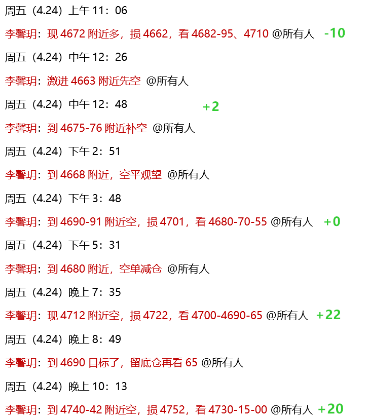 4.24 周五,黄金依旧反复洗盘,基本符合策略震荡预期,但今日盘中操作有些磕绊,午间先是4672多单,可惜没有坚定持有,扫损出局!欧盘的4691空单,到4680获利减仓,晚间的4712空单到4690目标!美盘按策略安排的4740空单,目前回落到4718附近!盘尾保持震荡对待,压力在4740-43、4770-73,支撑在4665、4645,高抛低吸为主!