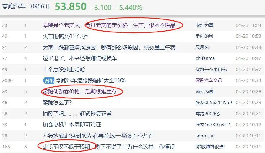 但资本市场并不买账,有投资者认为:这是市场竞争加剧的表现,因此将零跑今年的盈利预期下调。于是,4月20日,零跑汽车股价一度大跌10%。但也有投资者坚定买入,导致大跌后股价又被拉了起来,多空分歧十分剧烈。