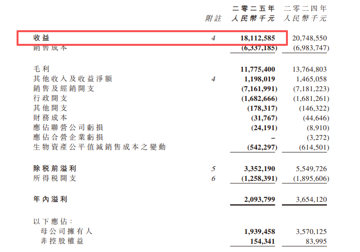 2025年,飞鹤的营业收入为181.12亿元,同比下滑12.7%,归母净利润为19.39亿元,同比骤降45.68%。所以这份数据很直观,那就是在去年全年当中飞鹤的营收与净利润呈“双降”现象,甚至创下了近年来的新低。