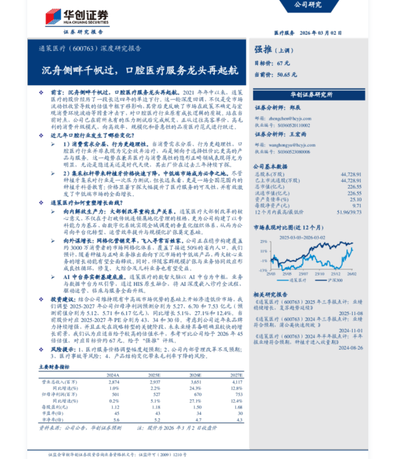 不可否认的是,华创证券研究所这几年的进取心很强,比如前不久刚刚发布的关于通策医疗的深度研报《沉舟侧畔千帆过,口腔医疗服务龙头再起航》,里面就用逻辑严密的内容推演了口腔医疗龙头的“品质医疗范式跃迁”。而且,华创证券研究所还给出了“强推”的评级。