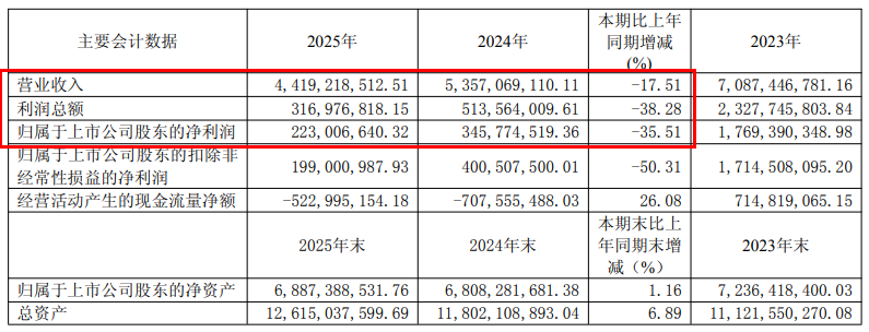 根据舍得酒业3月20日披露的2025年年度报告,公司全年实现营业收入44.19亿元,同比下滑17.51%,归母净利润2.23亿元,同比大跌35.51%,扣除非经常性损益净利润更是下降50.31%,接近腰斩。单看数据,这份成绩单依然属于白酒次高端梯队里的偏弱水平。