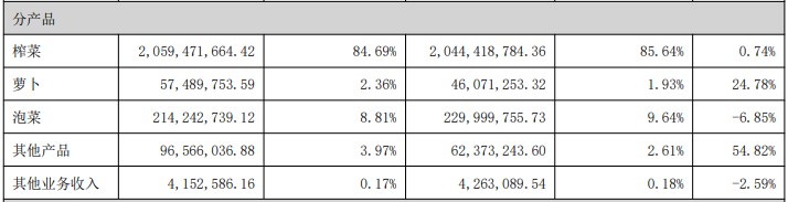 萝卜业务表现亮眼,收入5749万元,同比增长24.78%,成为为数不多的增长亮点;泡菜业务则拖了后腿,收入2.14亿元,同比下滑6.85%;新兴品类“其他产品”收入9657万元,同比大增54.82%,但占比不足4%,对整体拉动有限。