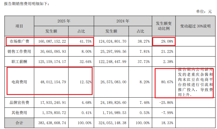 2025年,公司销售费用同比大增18.33%,达到3.83亿元。其中,电商费用激增80.67%至4801万元,主要用于“老重庆杂酱”“肉末豇豆”等新品在抖音等平台的引流推广;市场推广费同比增长29.08%至1.60亿元,占销售费用的41.75%。公司解释称,这是为了“稳固榨菜存量市场、拓展新兴渠道、助推新品上市”而加大投入。