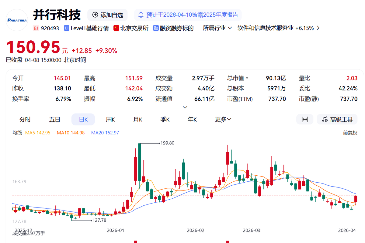 在业绩修正公告发布之后,并行科技的股价并未大幅下挫,反而在高位横盘。