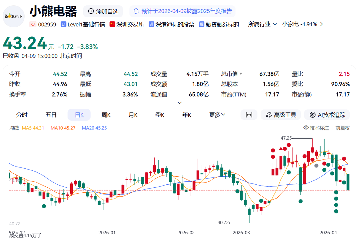 但财报发布后,小熊电器二级市场表现却不尽人意,截至4月9日收盘,报43.24元每股,跌幅3.83%。