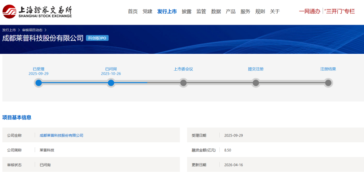 4月16日,上交所披露其科创板IPO问询回复,莱普科技距敲钟再近一步。