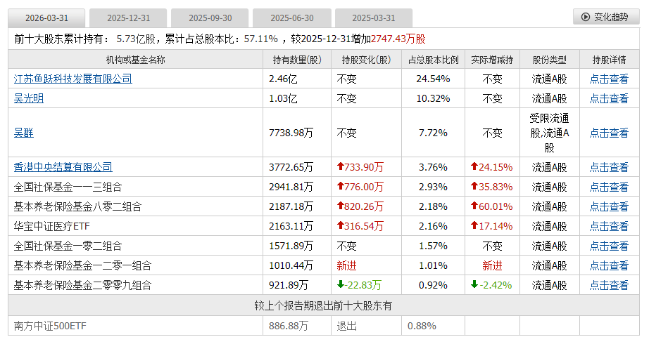 截至2026年3月31日,鱼跃医疗前十大股东中,社保基金和养老金合计占据了五席。