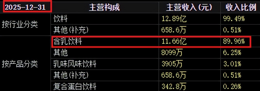 从产品结构看,2021年含乳饮料占总营收97.12%,此后持续占据绝对主力,直到2025年因新品放量才降至约89.97%。含乳饮料营收本身则从2021年的14.27亿峰值,一路萎缩至2025年的11.66亿。