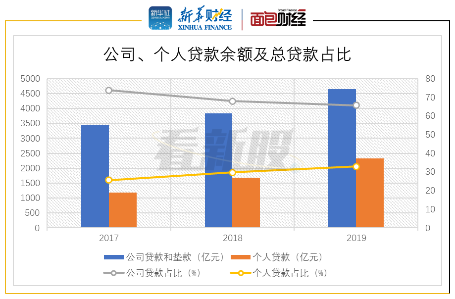 图4:2017-2019年渤海银行公司、个人贷款余额及总贷款占比