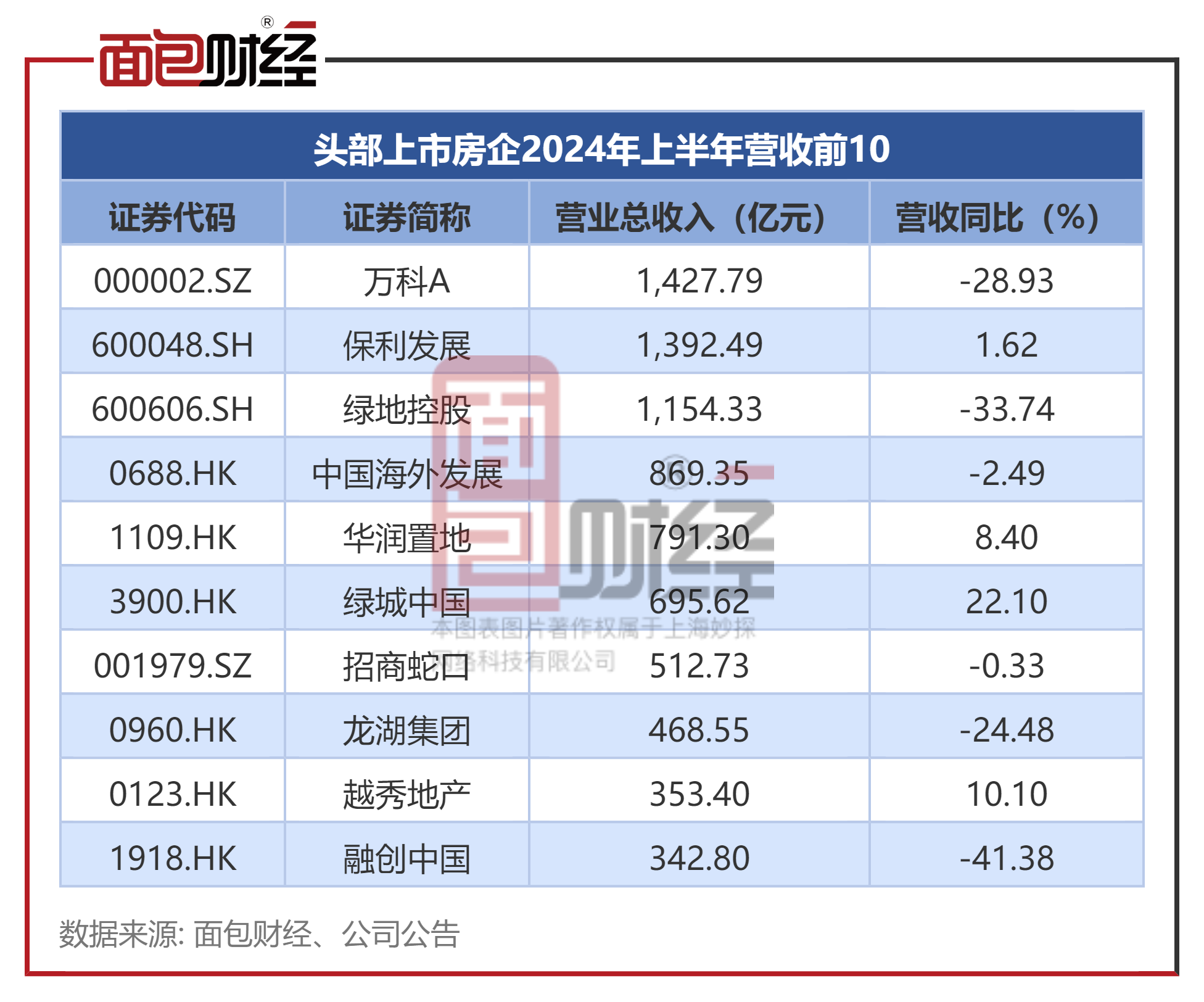 2024年上半年营收超过千亿元的上市房企有3家,分别为万科、保利发展及绿地控股。