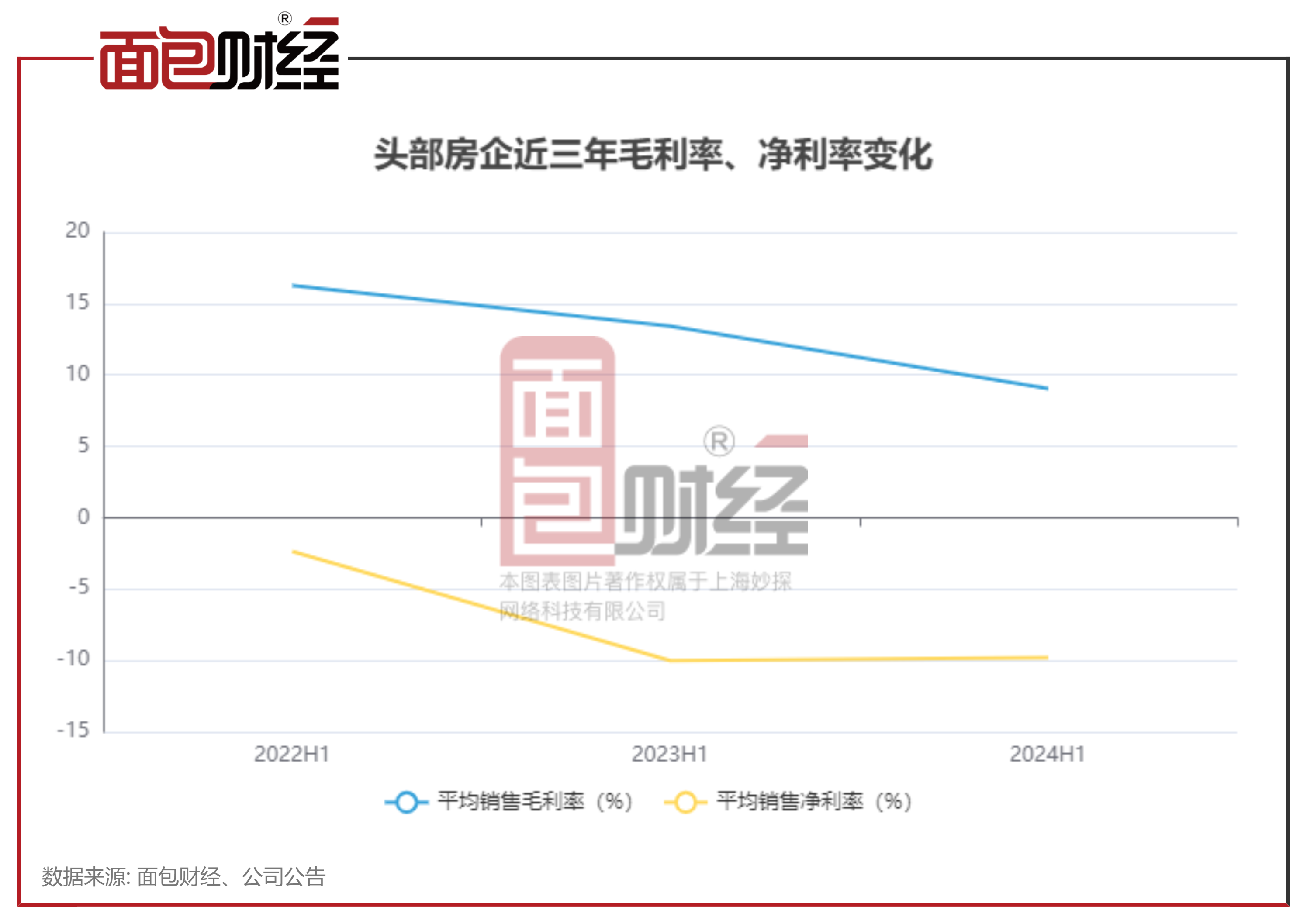 从中报数据来看,行业整体毛利率持续探底。统计显示,头部房企2024年上半年销售毛利率平均数为9.04%,同比下降超过4个百分点。