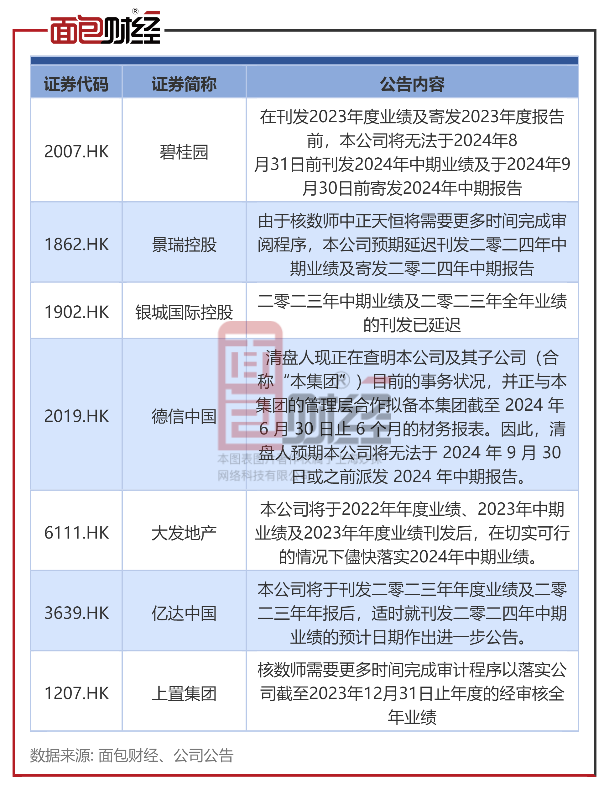 值得关注的是,据不完全统计,截至9月10日,仍有多家房企未按时刊发2024年中期业绩,多为港股上市房企,延迟刊发业绩主要受更换核数师、债务重组、2023年年报未刊发等因素影响。