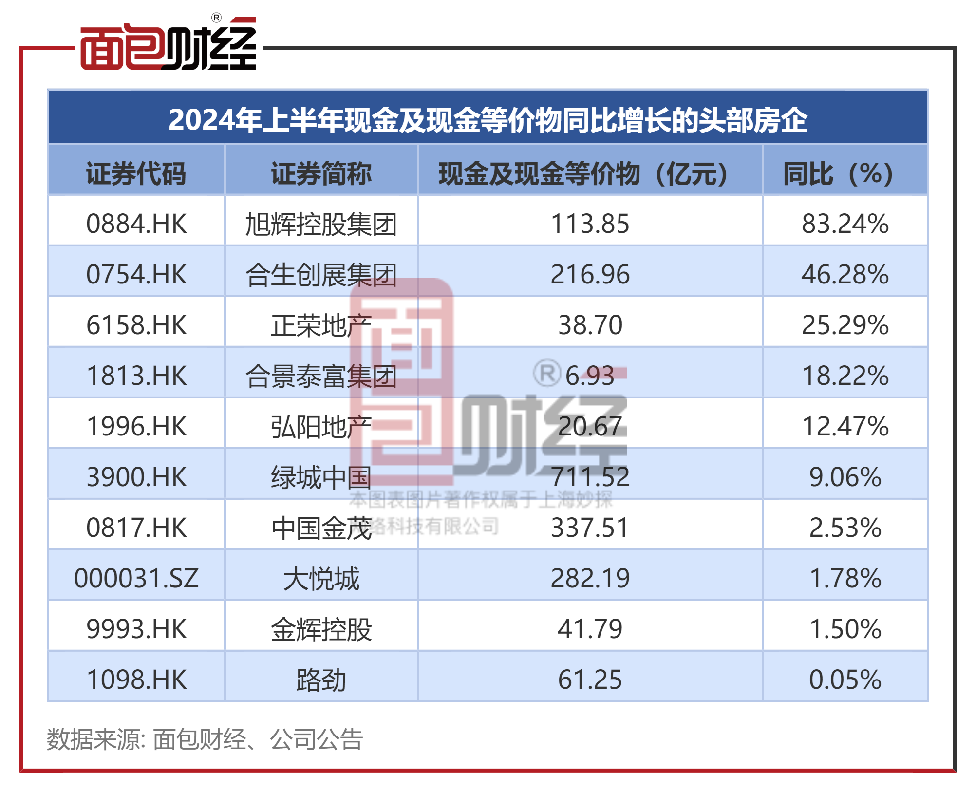 现金方面,2024年上半年头部上市房企现金及现金等价物总额约为1.15万亿元,同比减少近二成。10家房企在手现金较去年同期上升,包括旭辉控股集团、合生创展集团、中国金茂等。