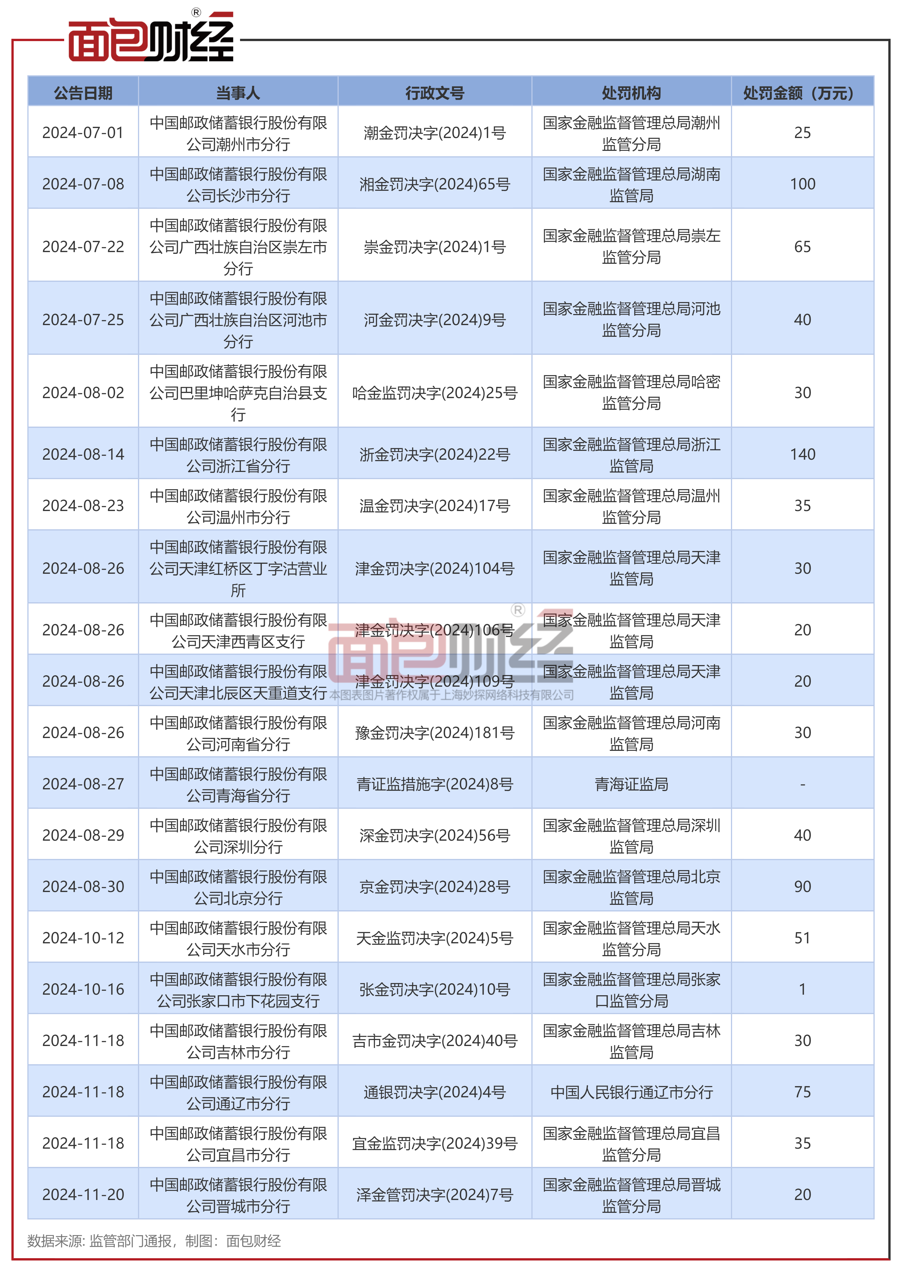 面包财经根据监管部门通报统计,下半年以来,邮储银行多次被处罚,累计被罚没超870万元,其中有两张百万元罚单。