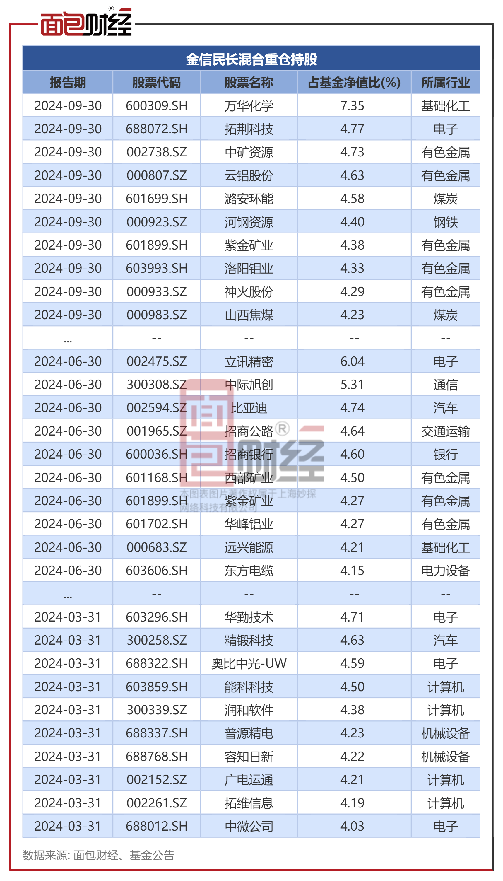 研究显示,金信民长混合2024年一季度重点投资于高端装备、人工智能等方向,二季度减仓人工智能方向、转而投资于基础材料方向,三季度则基本放弃了科技赛道,转而投资于基础材料、上游资源品方向。