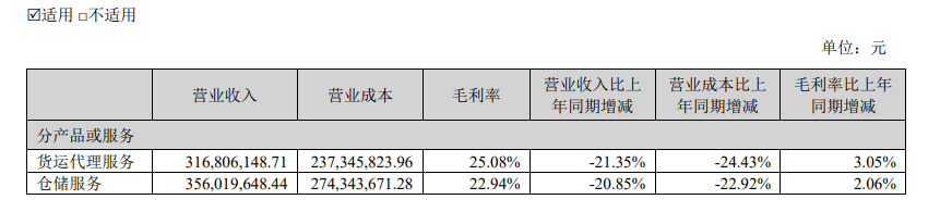 2024年上半年,海晨股份实现营收8.12亿元,其中来自货运代理服务、仓储服务的营收分别为3.17亿元、3.56亿元,同比均下滑20%以上。