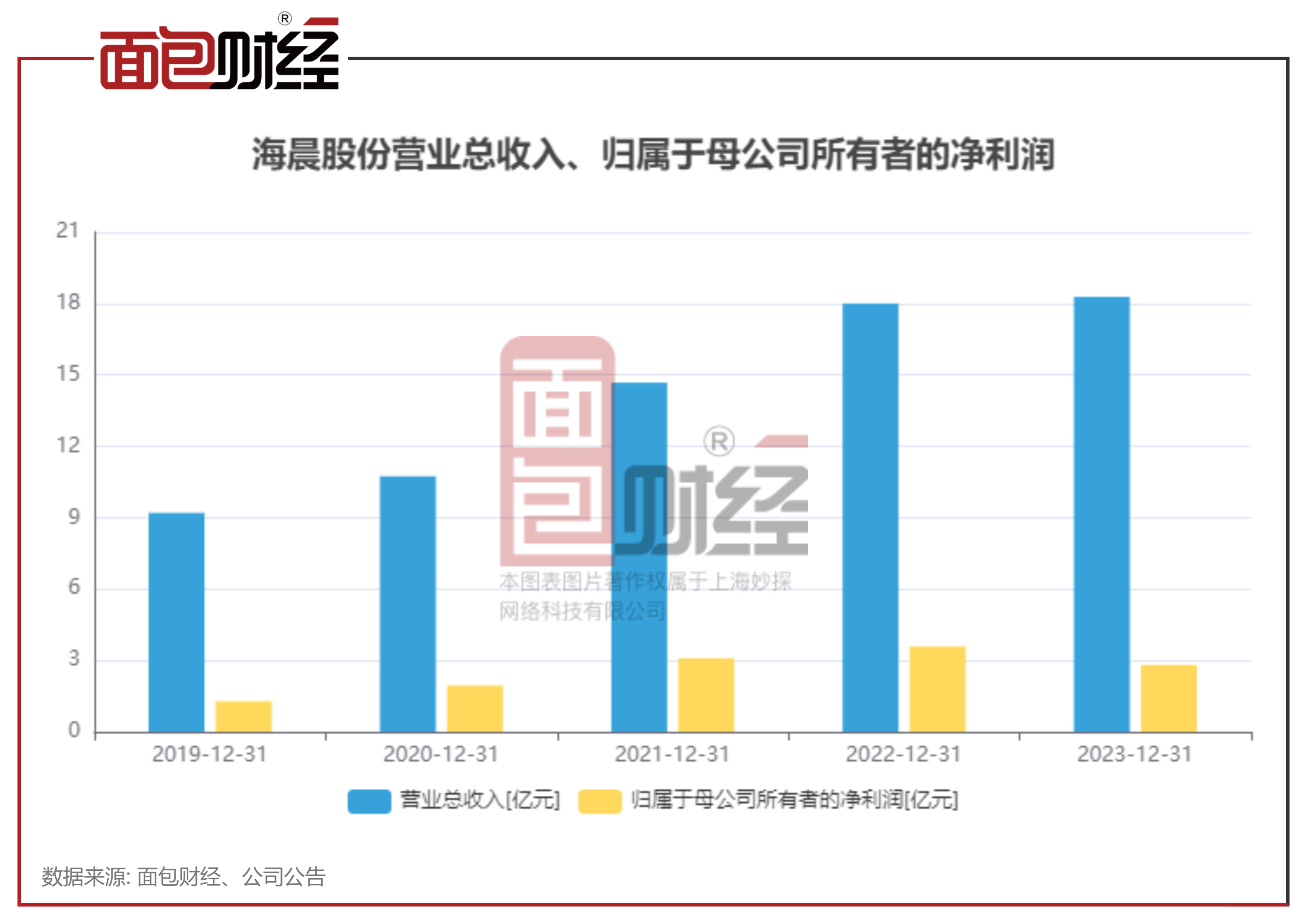 查阅最近5年的财务数据,海晨股份的营收从2019年9.2亿元上升至2023年18.28亿元;同期的归母净利润从1.28亿元上升至2.81亿元。