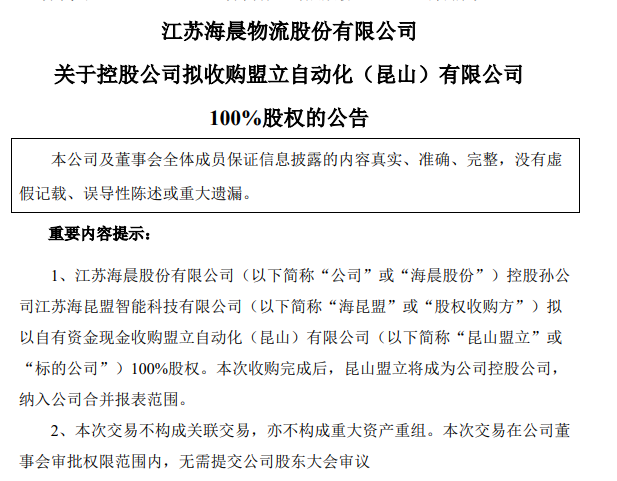 2023年10月,海晨股份公告拟收购盟立自动化(昆山)有限公司(简称“昆山盟立”) 100%股权。昆山盟立100%股权转让价格为1.8亿元。