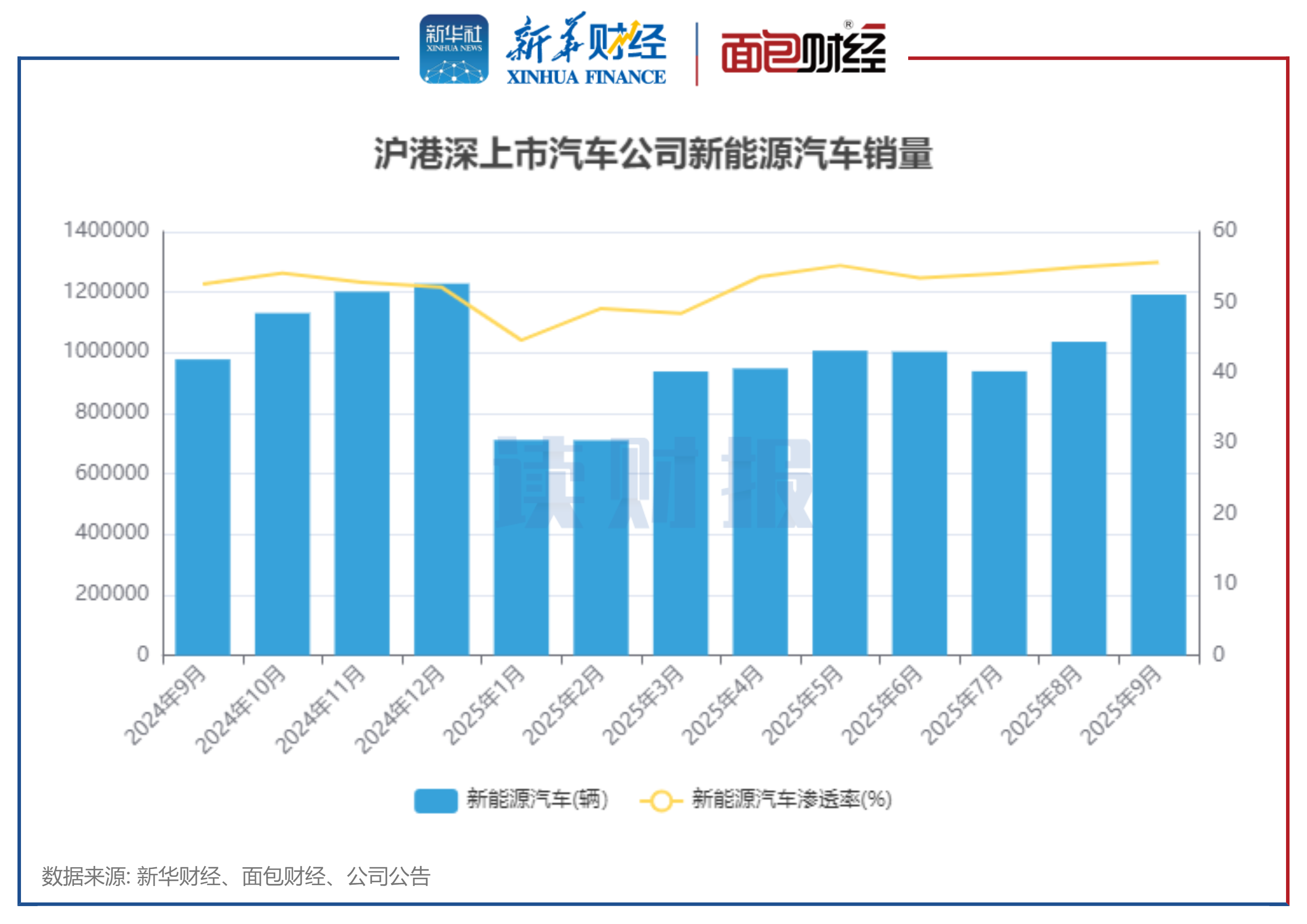 2025年9月,16家上市车企合计销售新能源汽车约119.24万辆,同比上升21.9%,环比上升15.04%。当月新能源汽车渗透率约达55.69%,较8月进一步增长0.69个百分点。