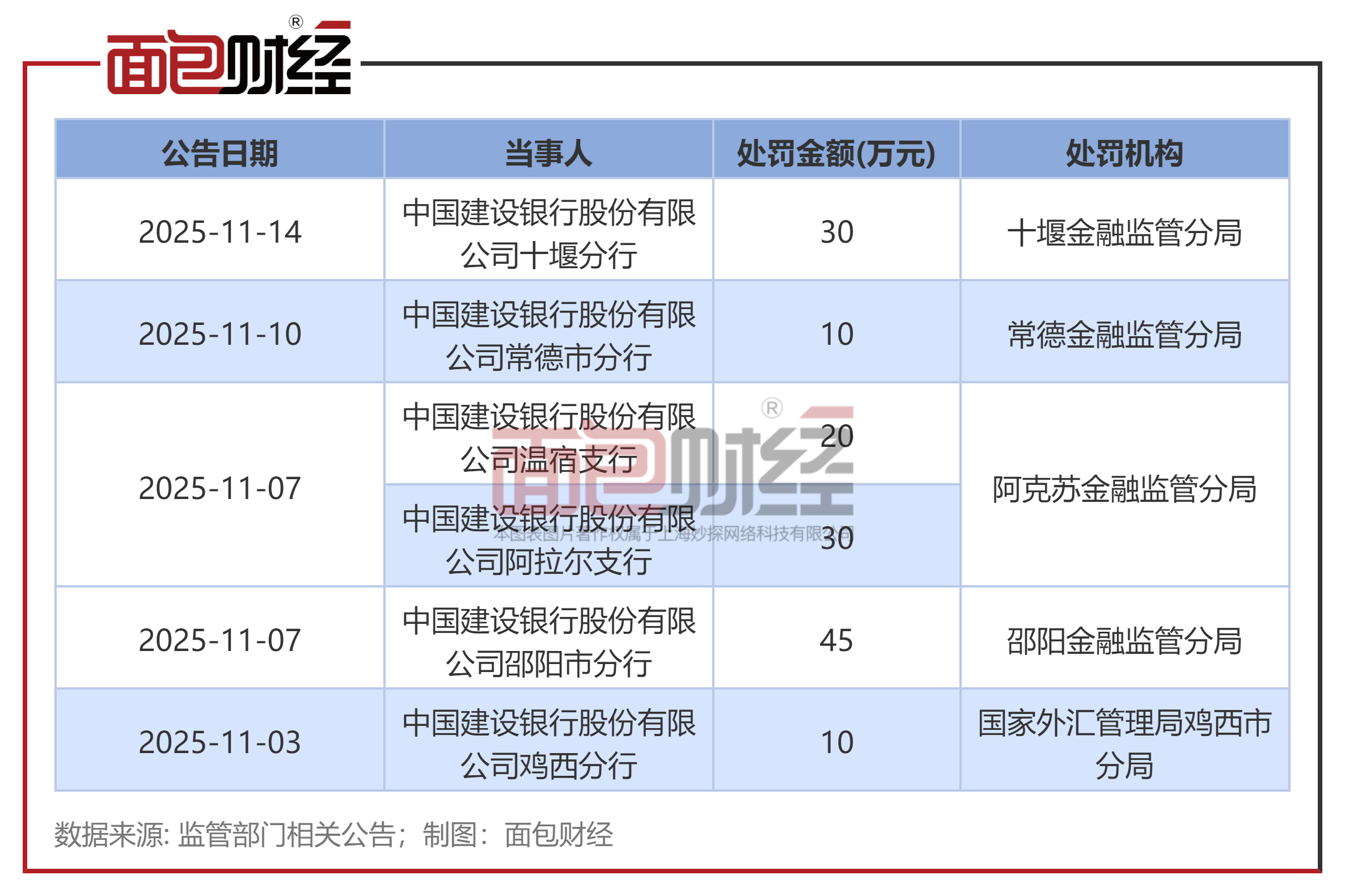 统计数据显示,11月以来建设银行已经收到5张罚单,累计罚没145万。公开信息显示其中,11月7日,建设银行收到两张罚单,三家机构被罚。具体来看,中国建设银行股份有限公司邵阳市分行因收费管理不规范、贷款管理不规范,邵阳金融监管分局对该分行罚款45万元。其相关责任人章卓、唐星、谭立异等被处以警告。同日,中国建设银行股份有限公司温宿支行和阿拉尔支行,均因业务管理不到位,被阿克苏金融监管分局分别处以罚款20万元和30万元。对相关责任人周坤、缪翔警告并罚款共计10万元。