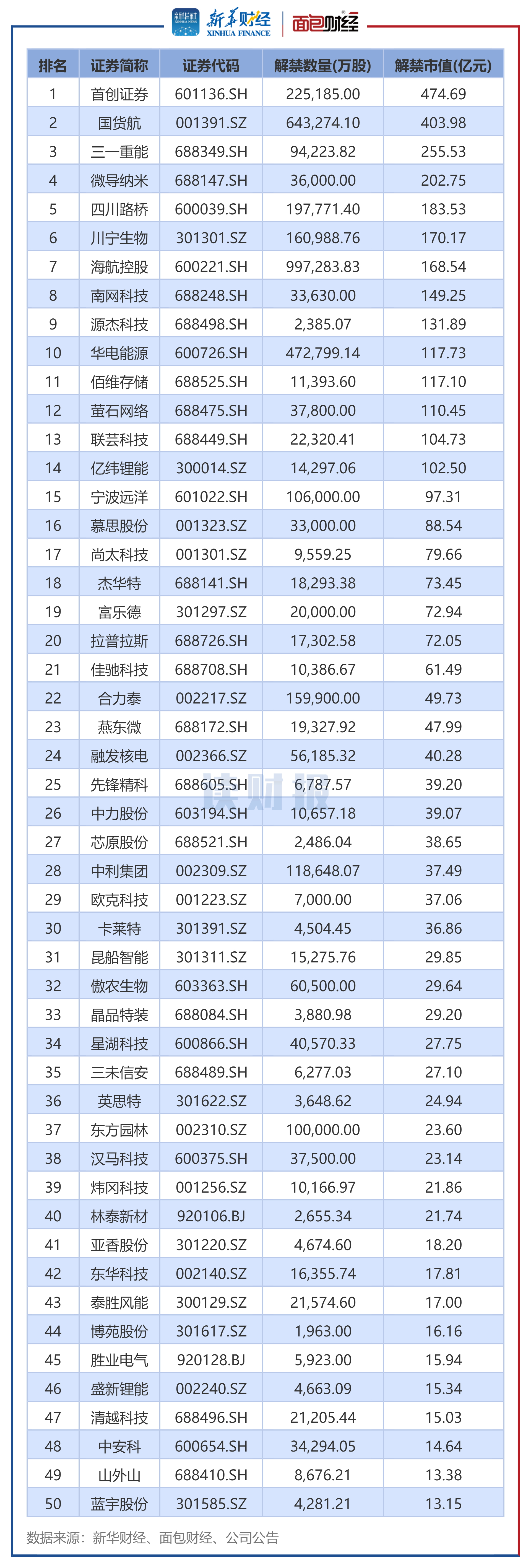 具体来看,首创证券、国货航、三一重能解禁规模位列前三。