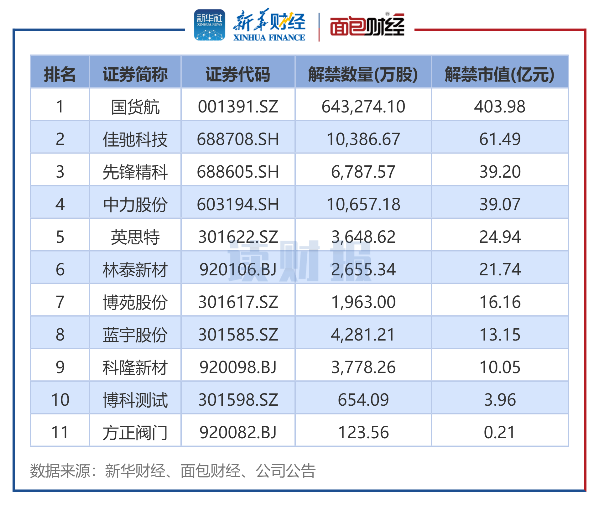 此外,共有11家上市公司、68.82亿股限售股于12月迎上市周年解禁,解禁市值为633.95亿元,包括国货航、佳驰科技、先锋精科等企业。