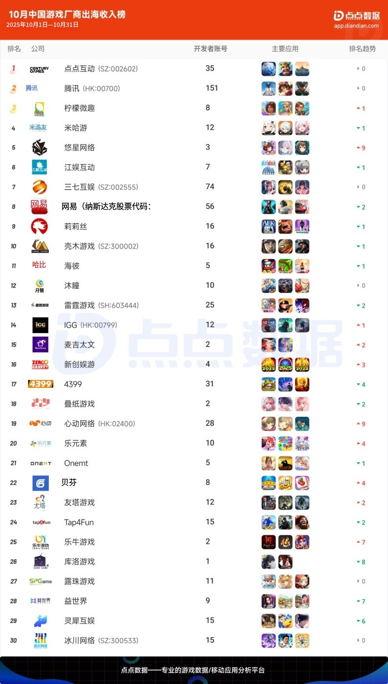 根据全球移动应用、游戏数据监测服务商点点数据近期披露的2025年10月中国游戏厂商出海收入榜,世纪华通旗下的点点互动排名第一,超过腾讯、米哈游等头部企业。
