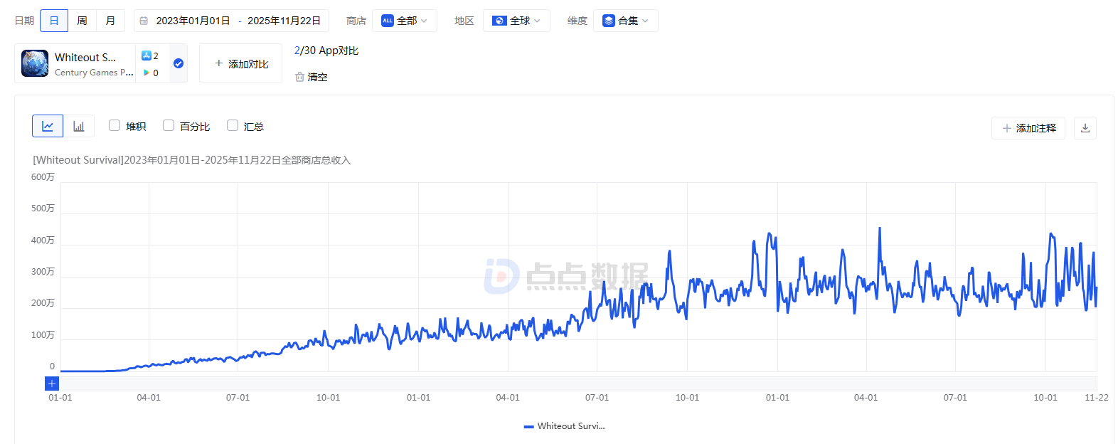 《Whiteout Survival》是全球首款冰雪题材策略类手游。根据点点数据的监测,《Whiteout Survival》(包括《无尽冬日》)来自全球iOS端的收入持续上升,最近1年保持稳定。