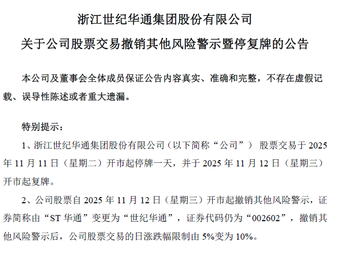 公司股票自2025年11月12日开市起撤销其他风险警示,证券简称由“ST华通”变更为“世纪华通”。