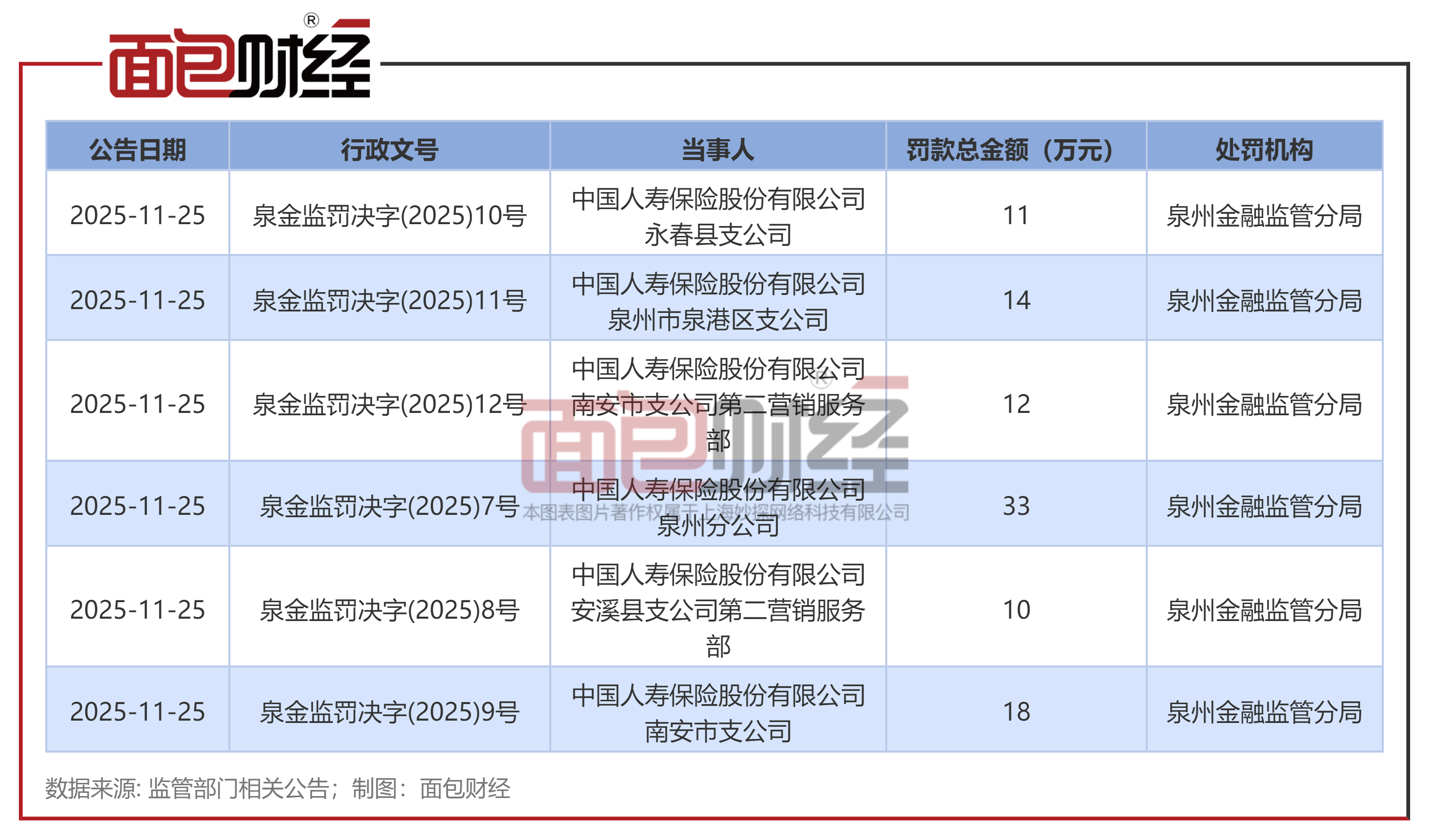 11月25日,泉州金融监管分局披露了多个中国人寿分支机构的行政处罚,共计6张罚单。