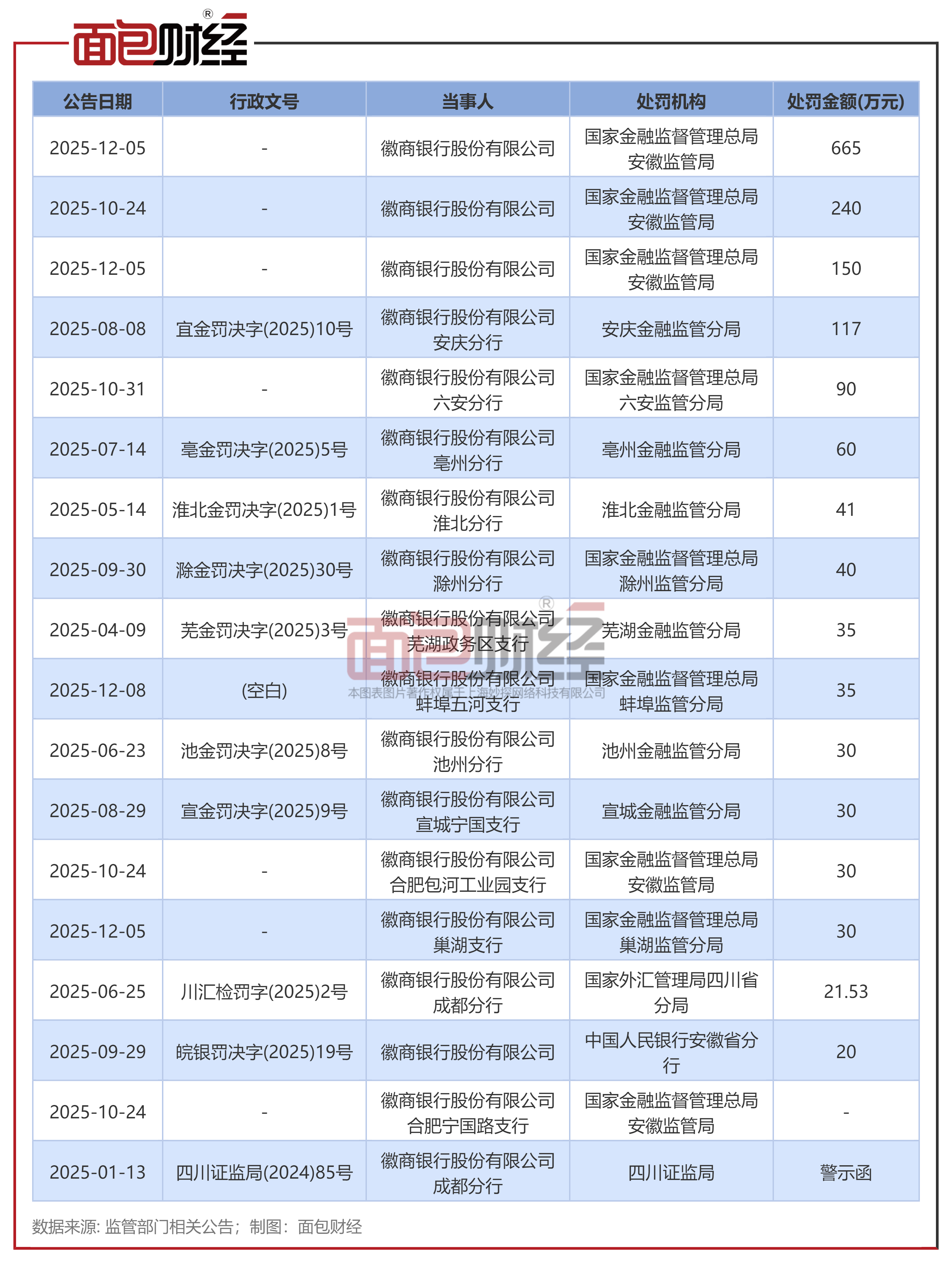 根据监管部门相关公告统计,2025年以来徽商银行已累计被罚没超1600万元,其中有4张超百万的大额罚单。