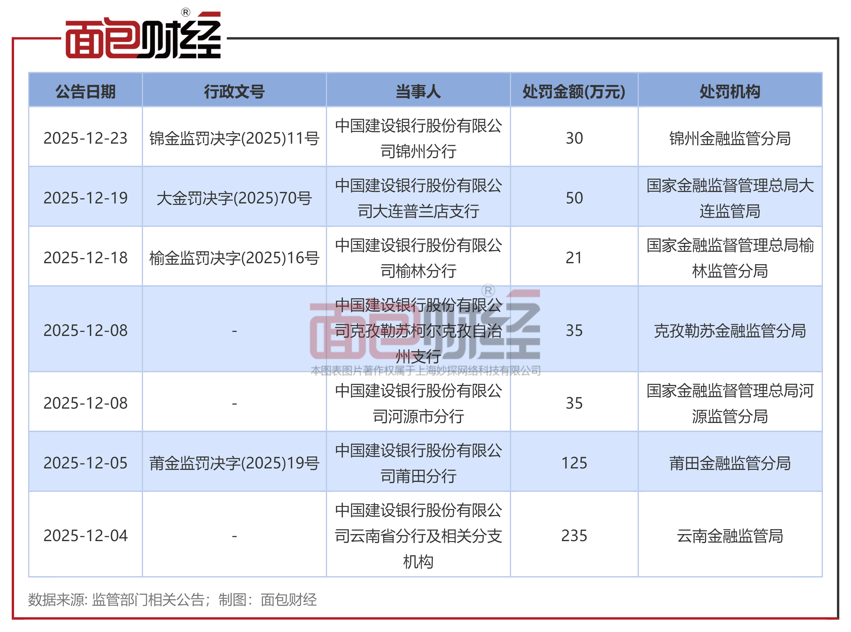 根据公开信息整理,2025年12月以来,建设银行已累计被罚没530万元,其中有两张罚单超过百万。